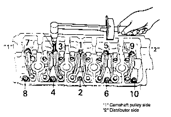 Apply engine oil to cylinder head bolts and tighten them gradually as follows: