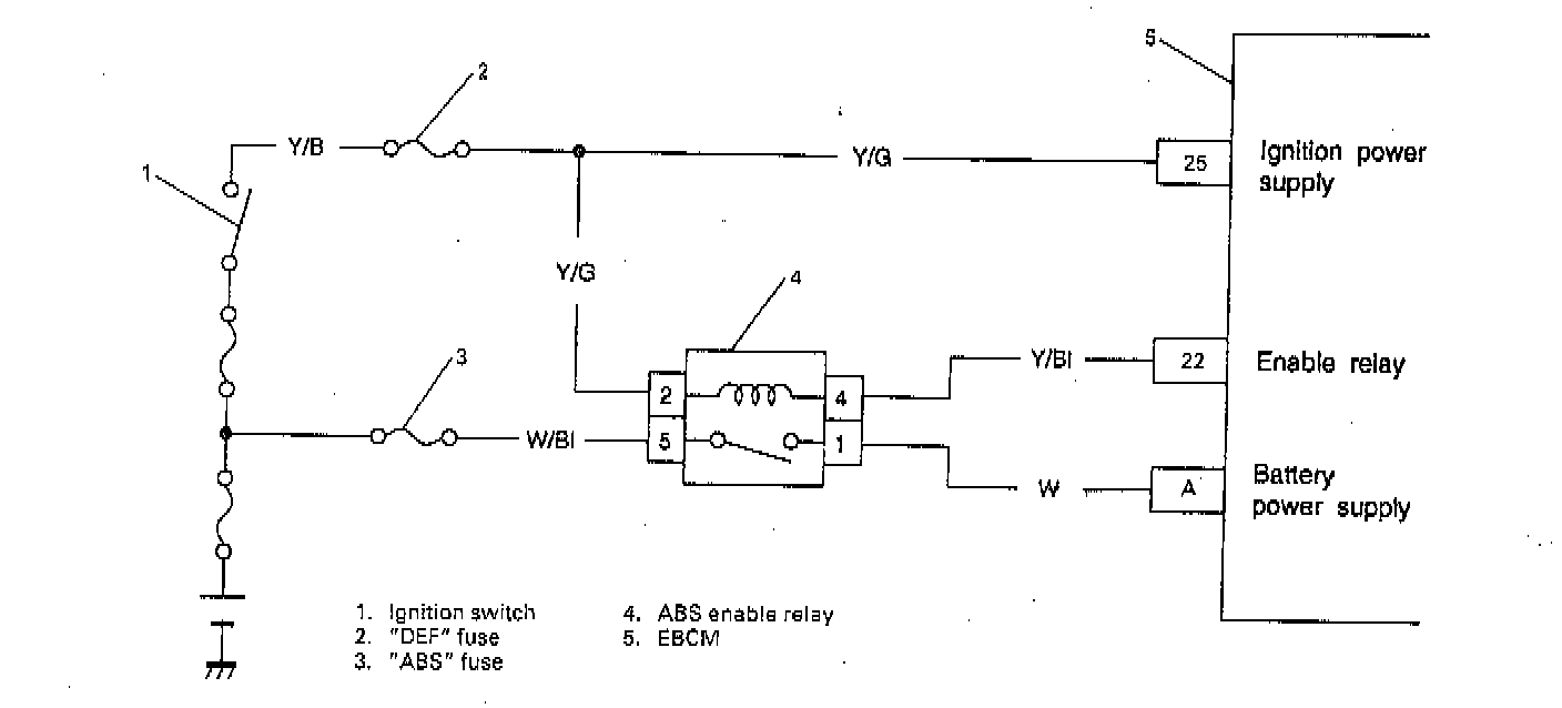 Ignition voltage is supplied through terminal "2" of the Antilock Brake System (ABS) enable relay. Then the Electronic Brake Control Module (EBCM) is able to energize the pull-in coil by completing the ground circuit at pin "22" of the EBCM. The magnetic field created closes the ABS enable relay contacts and allows battery voltage and current to be supplied to the EBCM, which supplies power to the motors and solenoids.