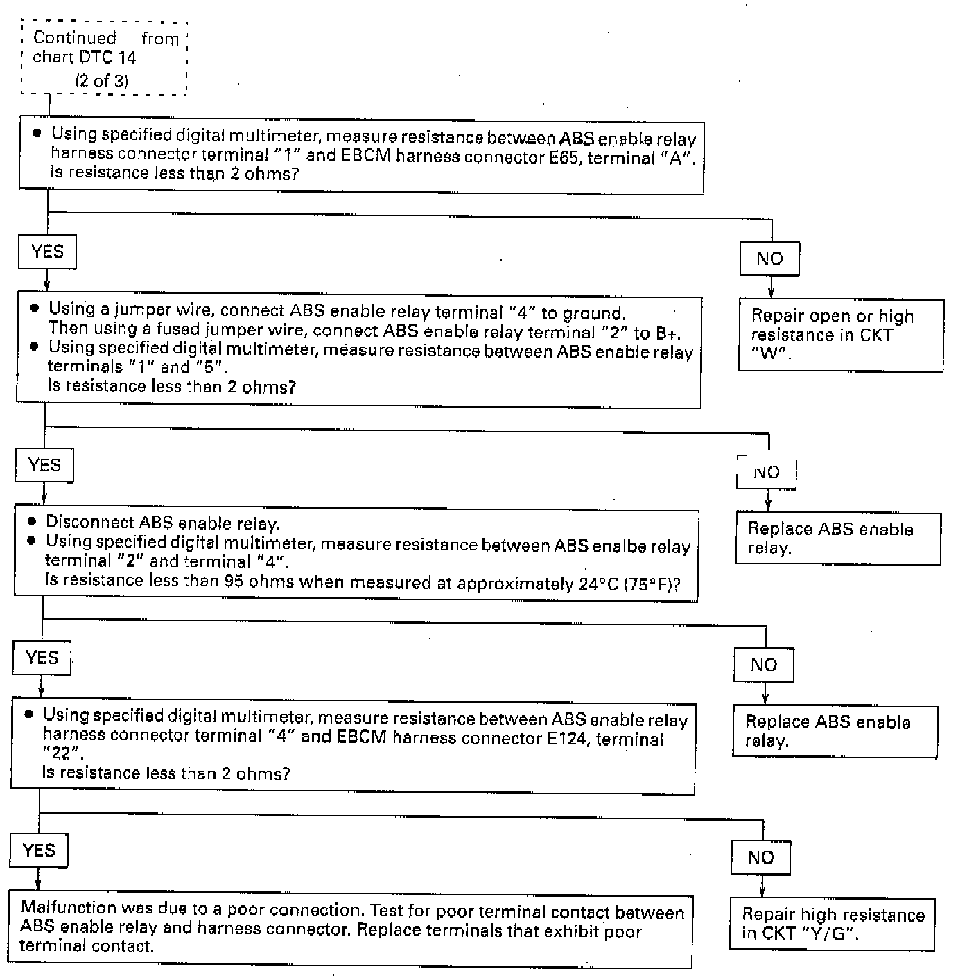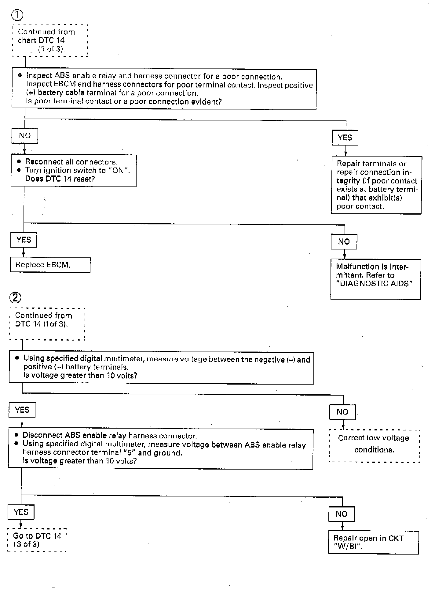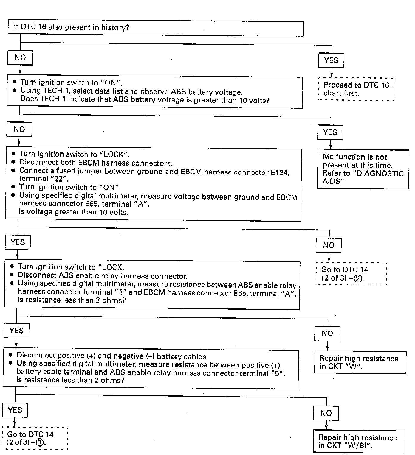 DTC14 can be set any time after the EBCM commands the ABS enable relay on (the relay is first commanded on during initialization). This test monitors the availability of current/voltage to the motors and solenoids. This malfunction indicates voltage is not available and would therefore not allow ABS operation if required.