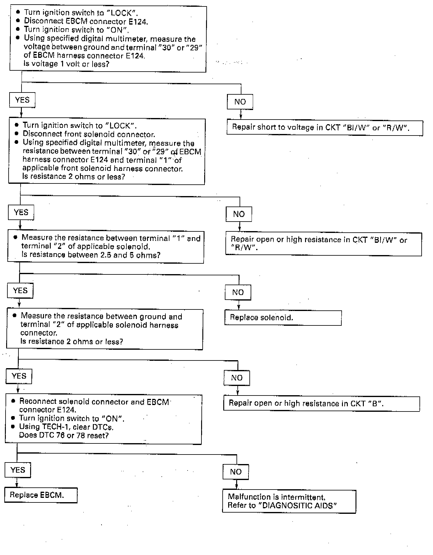 DTCs 76 and 78 can be set only when the solenoid is commanded off. If the Electronic Brake Control Module (EBCM) detects an excessive voltage in the solenoid control circuit, a malfunction exists.