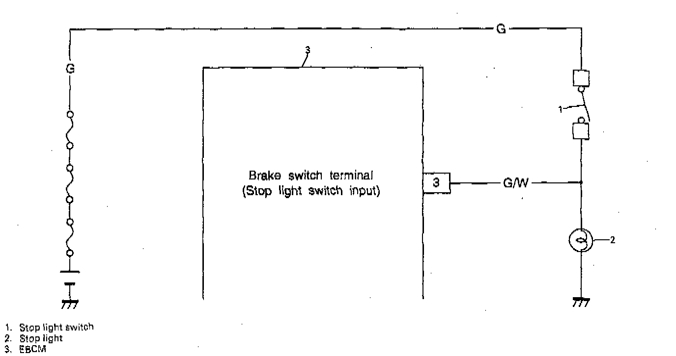 Also, verify proper stop light switch operation using the data list of the TECH-1. As the brake is applied, the data list should display the brake switch "ON" within 25 mm (1-inch) of travel.