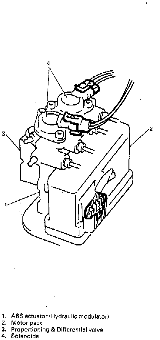 The Antilock Brake System (ABS) actuator assembly is located on the right or left side front wheel housing panel in the engine room and controls the brake fluid pressure to the front calipers and rear wheel cylinders to prevent wheel(s) lock-up.