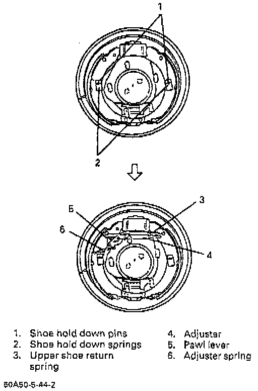 4. Remove shoe hold down springs by turning shoe hold down pins.