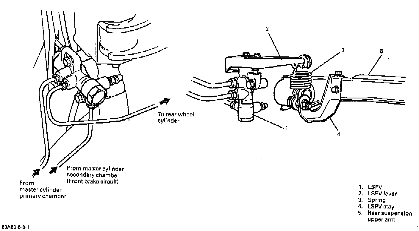 As shown in figure below, LSPV is included within the brake circuit which connects the master cylinder and the rear wheel brake. It controls the hydraulic pressure applied to the rear wheel brake according to the loaded state of the vehicle (or weight of the load), whereby preventing the rear wheels from getting locked prematurely.