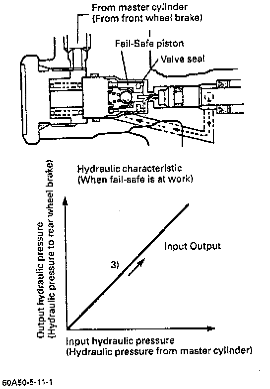 The main parts in this section are a chamber which draws in the hydraulic pressure from the front wheel brake system and a fail-safe piston which releases the valve mechanism in the control section connected to the rear wheel brake, should any failure occur in the front wheel brake system.