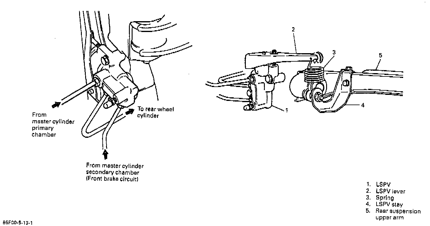 As shown in figure below, LSPV is included within the brake circuit which connects the rear wheel brake. It controls the hydraulic pressure applied to the rear wheel brake according to the loaded state of the vehicle (or weight of the load), whereby preventing the rear wheels from getting locked prematurely.