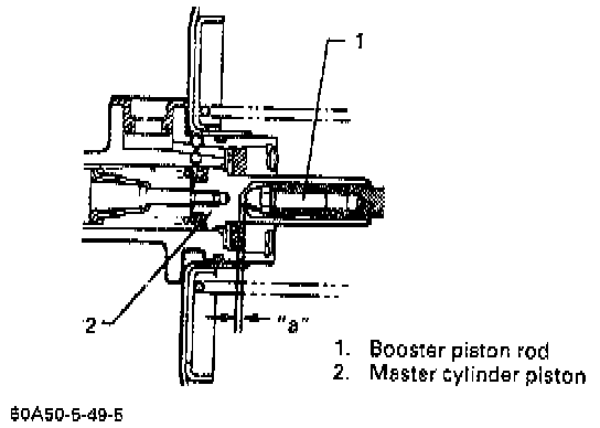 The length of booster piston rod is adjusted to provide specified clearance "a" between piston rod end and master cylinder piston.
