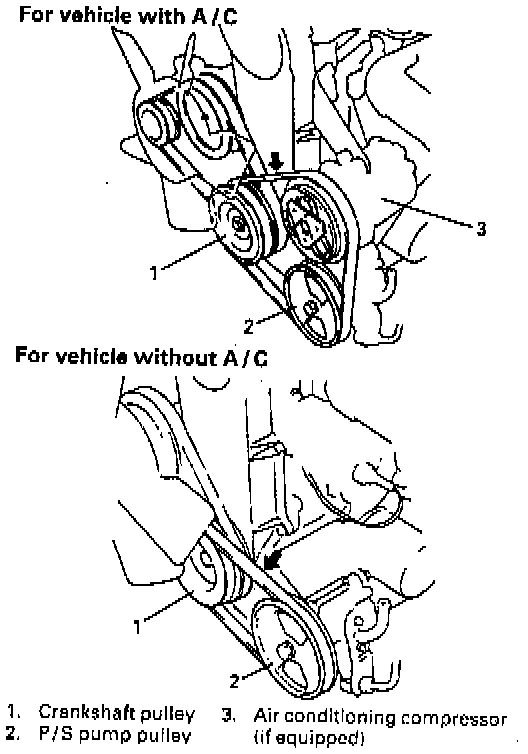 2. Check belt tension by measuring how much it deflects when pushed at intermediate point between P/S pump pulley and crank pulley with about 10 kg (22 lbs.) force.