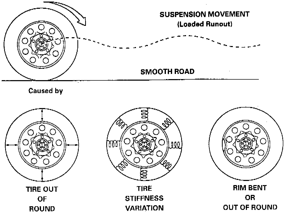 Measuring tire and/or wheel free runout will uncover only part of the problem. All three causes, known as loaded radial runout, must be checked by using a Tire Problem Detector (TPD). If a TPD is not available, the more time consuming method of substituting known good tire and wheel assemblies on the problem vehicle can be used.