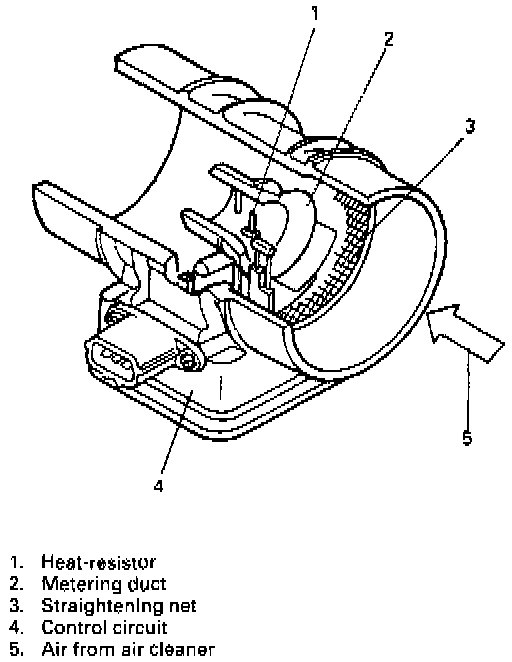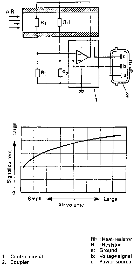 The heat resistor is cooled off by the intake air and the control circuit controls the heat-resistor temperature (the amount of electric current flowing to the heat-resistor) so as to keep it within a certain difference range from the ambient temperature. Then this control value is output as a current signal.