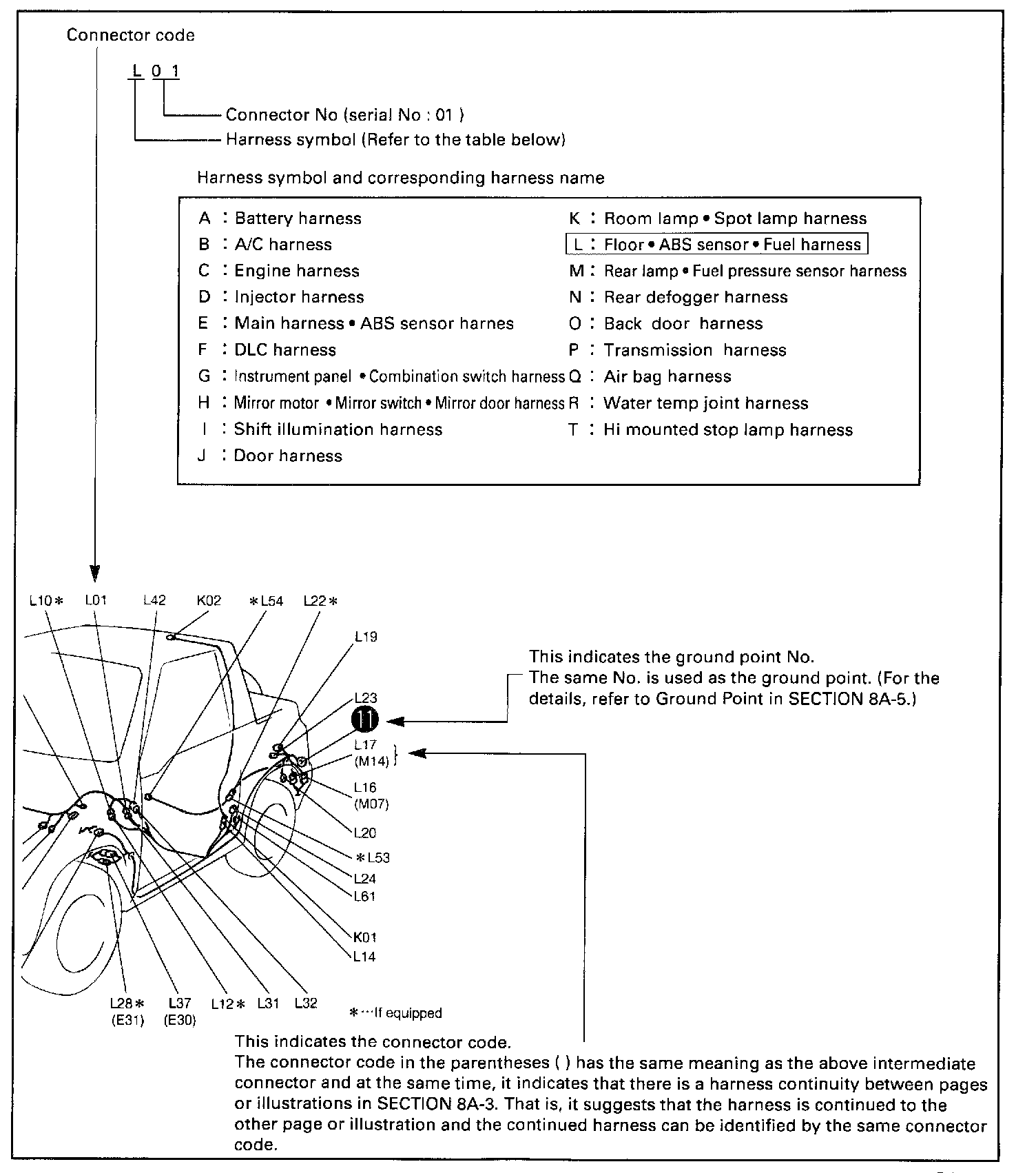 Each connector is identified by the code consisting of the harness symbol and the connector serial number as shown below. As each code is assigned to each connector in the system circuit diagram, it is easily possible to retrieve where the connector in question is located by using its code. To locate the connector, all you have to do is to look for the same code in Connector Layout Diagram.