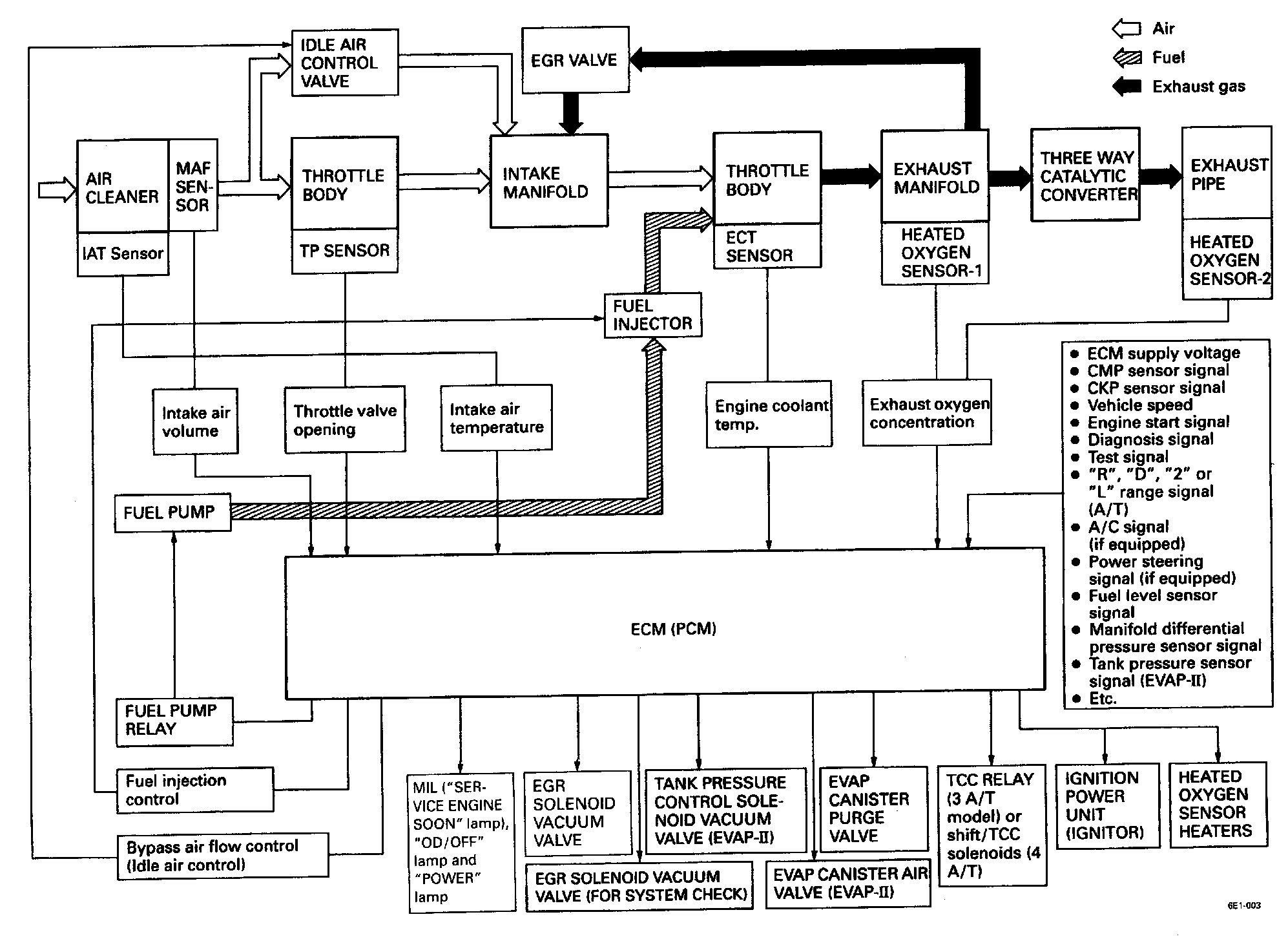 ELECTRONIC CONTROL SYSTEMThe electronic control system consists of 1) various sensors which detect the state of engine and driving conditions, 2) ECM (PCM) which controls various devices according to the signals from the sensors and 3) various controlled devices.