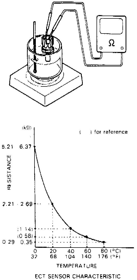 Immerse temperature sensing part of ECT sensor in water and measure resistance between sensor terminals while heating water gradually.