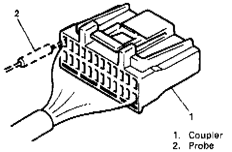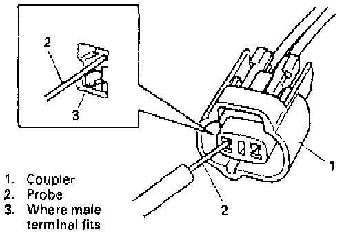 - When connecting meter probe from terminal side of coupler because it can't be connected from harness side, use extra care not to bend male terminal of coupler of force its female terminal open for connection. In case of such coupler as shown connect probe as shown to avoid opening female terminal. Never connect probe where male terminal is supposed to fit.
