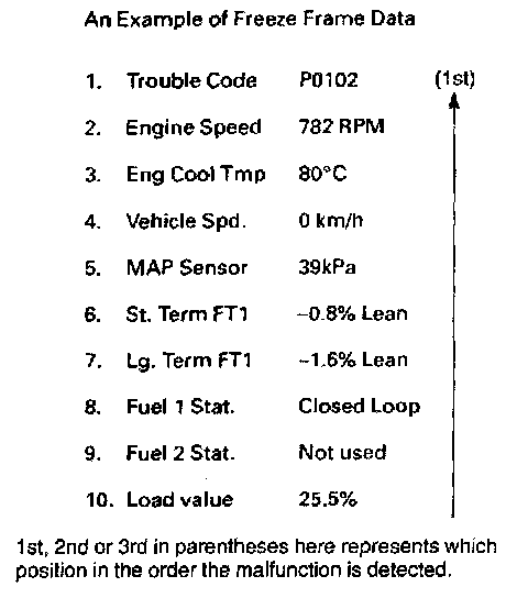 Therefore, it is possible to know engine and driving conditions (e.g., whether the engine was warm or not, where the vehicle was running or stopped, where air/fuel mixture was lean or rich) when a malfunction was detected by checking the freeze frame data. Also, ECM has a function to store each freeze frame data for three different malfunctions in the order as the malfunction is detected. Utilizing this function, it is possible to know the order of malfunctions that have been detected. Its use is helpful when rechecking or diagnosing a trouble.