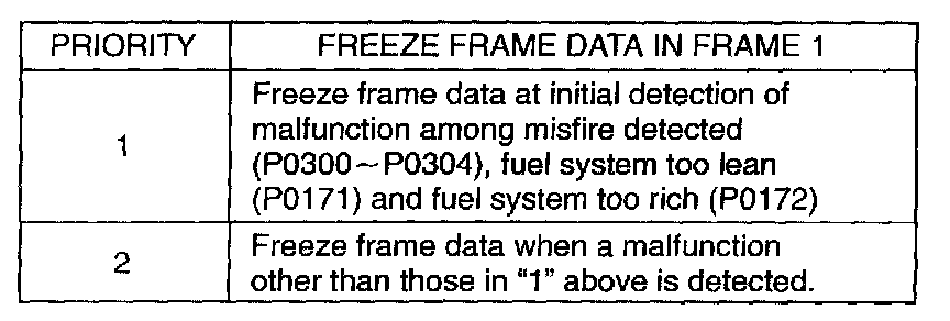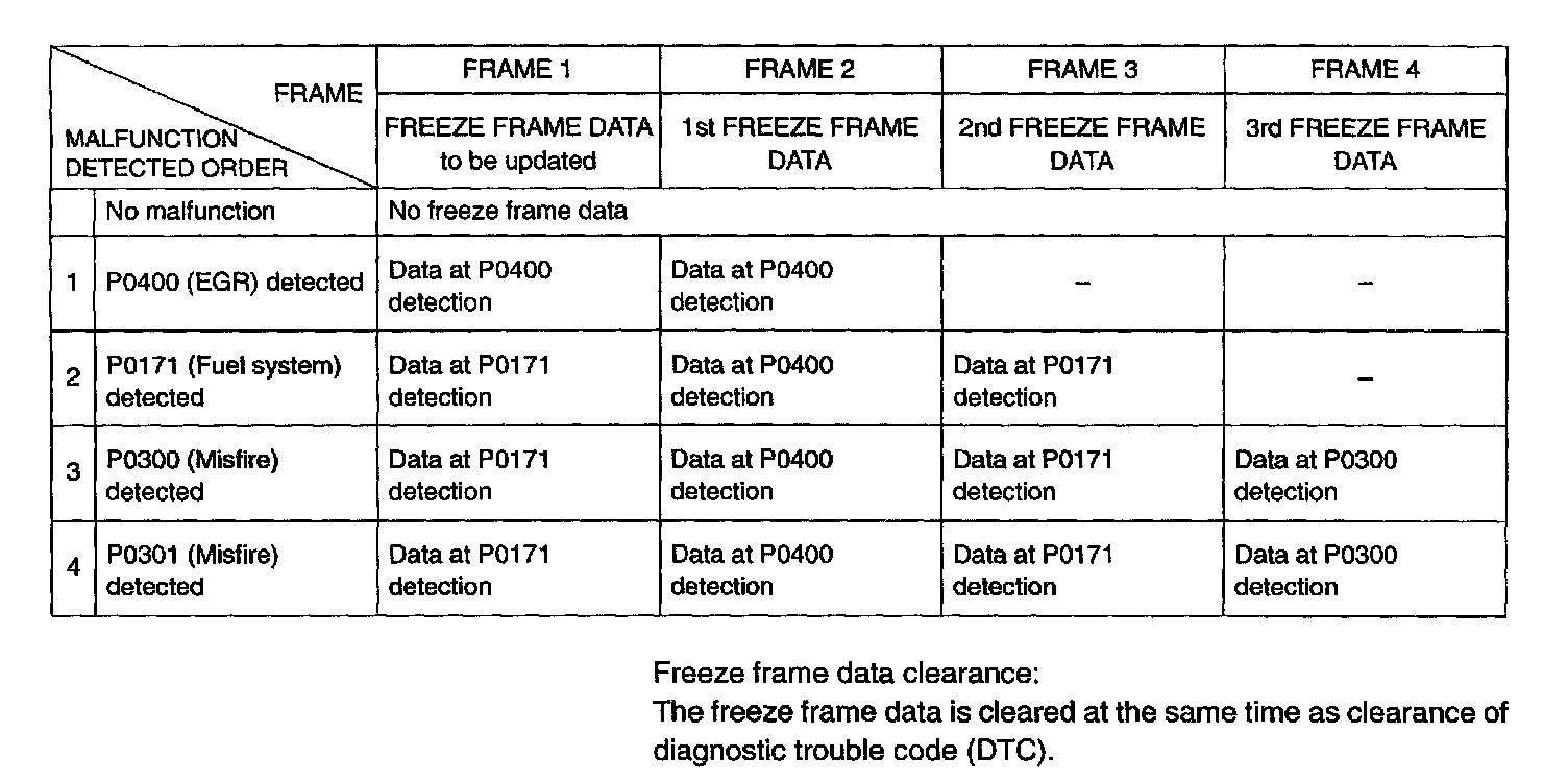 Shown in the table above are examples of how freeze frame data are stored when two or more malfunctions are detected.