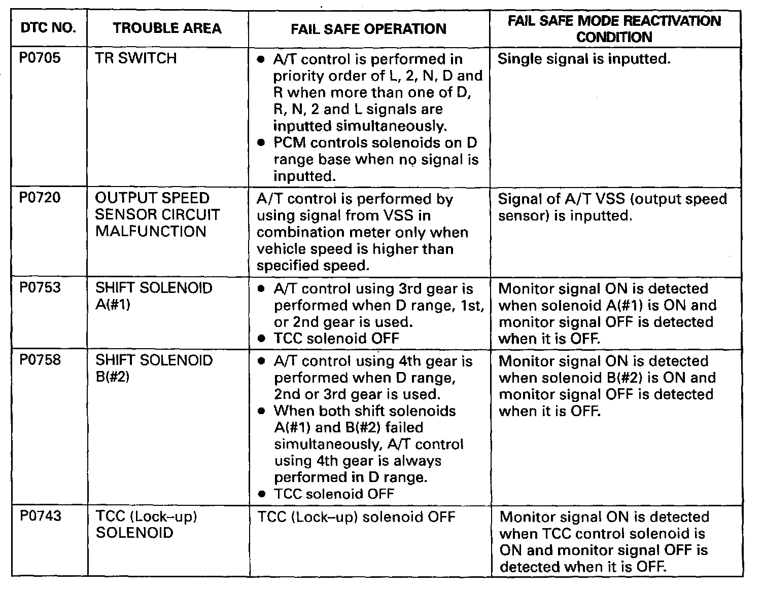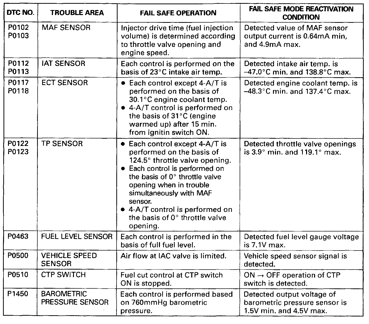 When any of the following DTCs is detected, ECM (PCM) enters fail-safe mode as long as malfunction continues to exist but that mode is canceled when ECM detects normal condition after that.