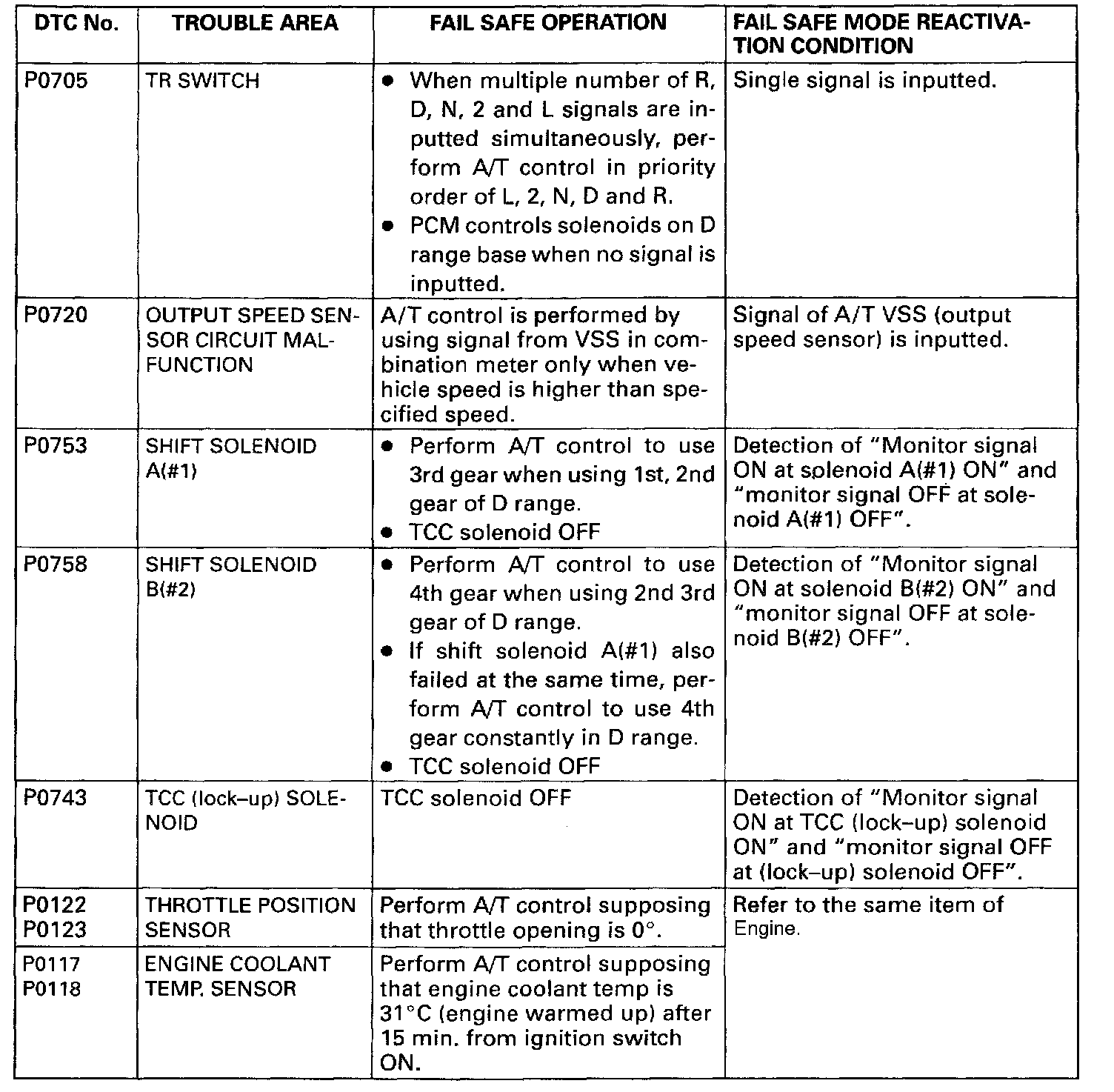 When any of the following DTCs is detected, PCM (ECM) enters failsafe mode as long as malfunction continues to exist but that mode is canceled when PCM detects normal condition after that.