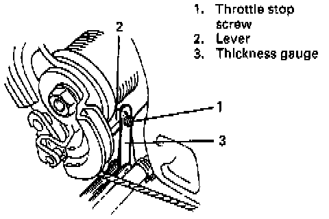 2) Insert 0.65 mm (0.026 in) thickness gauge between throttle stop screw and throttle lever.