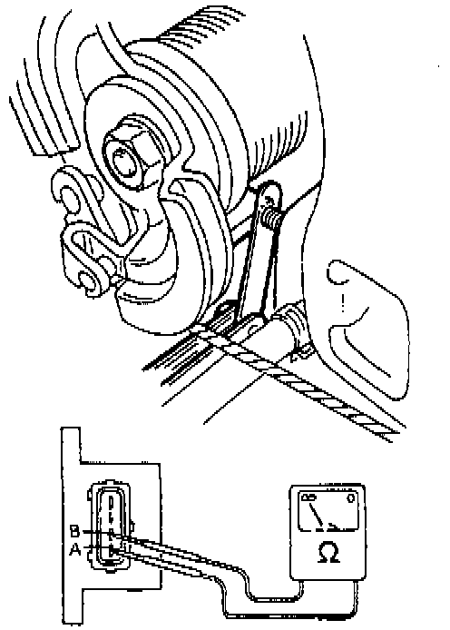 6) Check that there is no continuity between terminals A and B when 0.8 mm (0.037 in) thickness gauge is inserted.