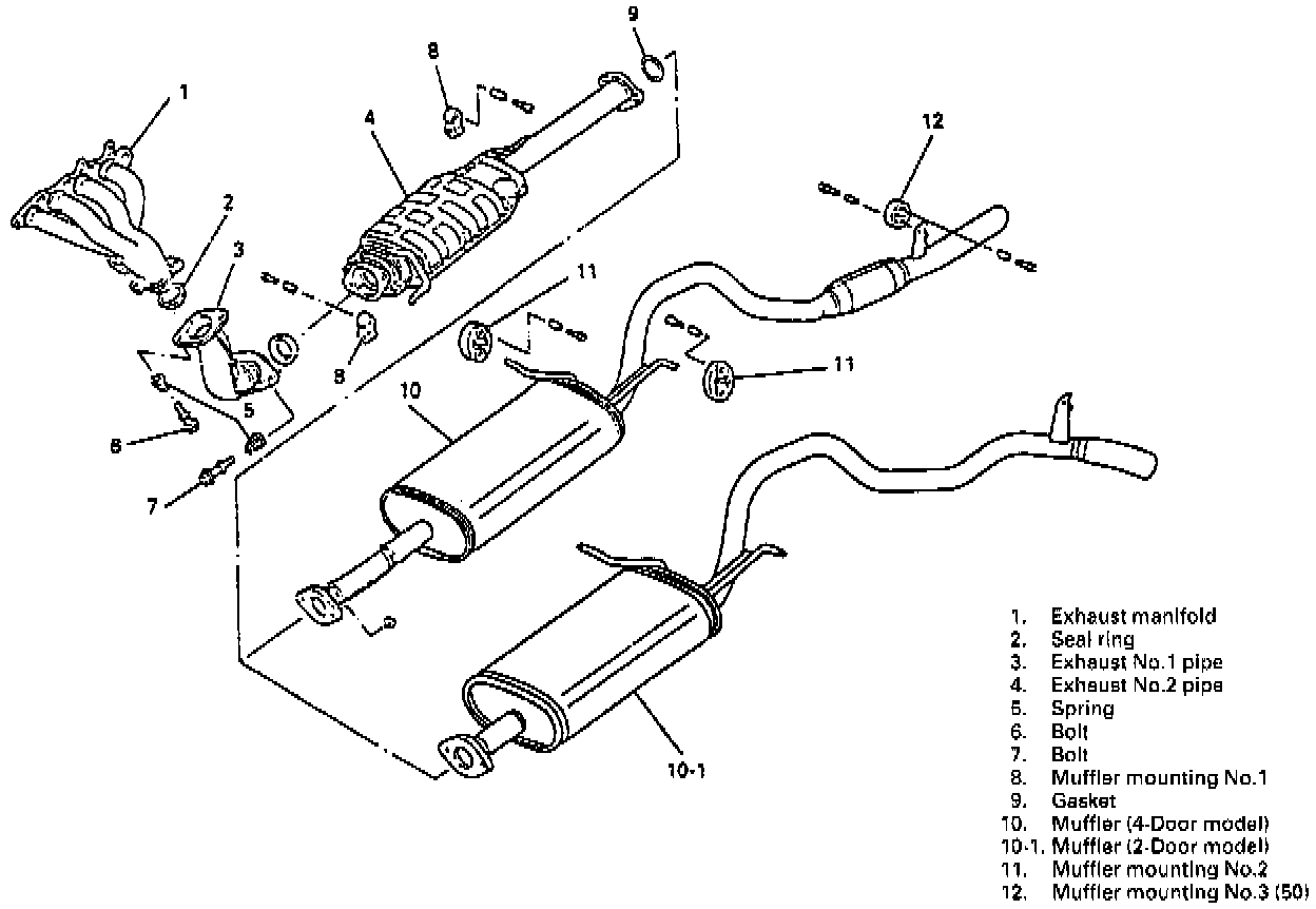 The exhaust system of the vehicle consists of the exhaust manifold, exhaust No.1 pipe, exhaust No.2 pipe, muffler, seals, gasket, etc. The three way catalytic converter is an emission control device added to the exhaust system to lower the level of Hydrocarbon (HO), Carbon Monoxide (CO) and Oxides of Nitrogen (NOx) pollutants in the exhaust gas.