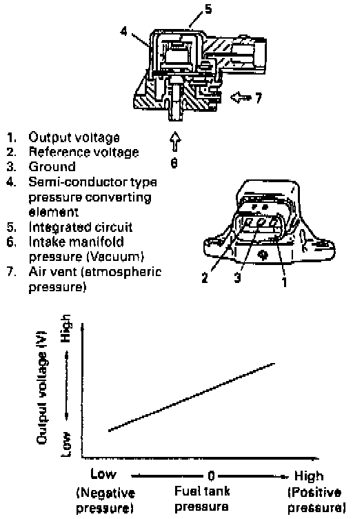 This sensor senses pressure difference between the fuel tank and atmosphere, and converts it into voltage change. It consists of a semiconductor type pressure converting element which converts a pressure change into an electrical change and an electronic circuit which amplifies and corrects the electric change.