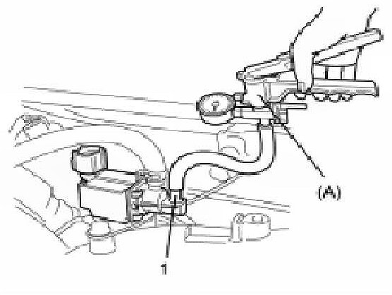 2. Apply -53kPa (-7.69Psi) to -67kPa (-9.72Psi) vacuum pressure to outlet nozzle (1) of EVAP canister purge valve by using special tool. If vacuum is held go to the next step. If not replace EVAP canister purge valve with new one.