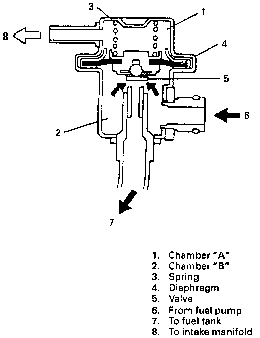 When the fuel pressure rises more than 290 kPa (2.9 kg/cm2, 41.2 psi) higher than the intake manifold pressure, the fuel pushes the valve in the regulator open and excess fuel returns to the fuel tank via the return line.