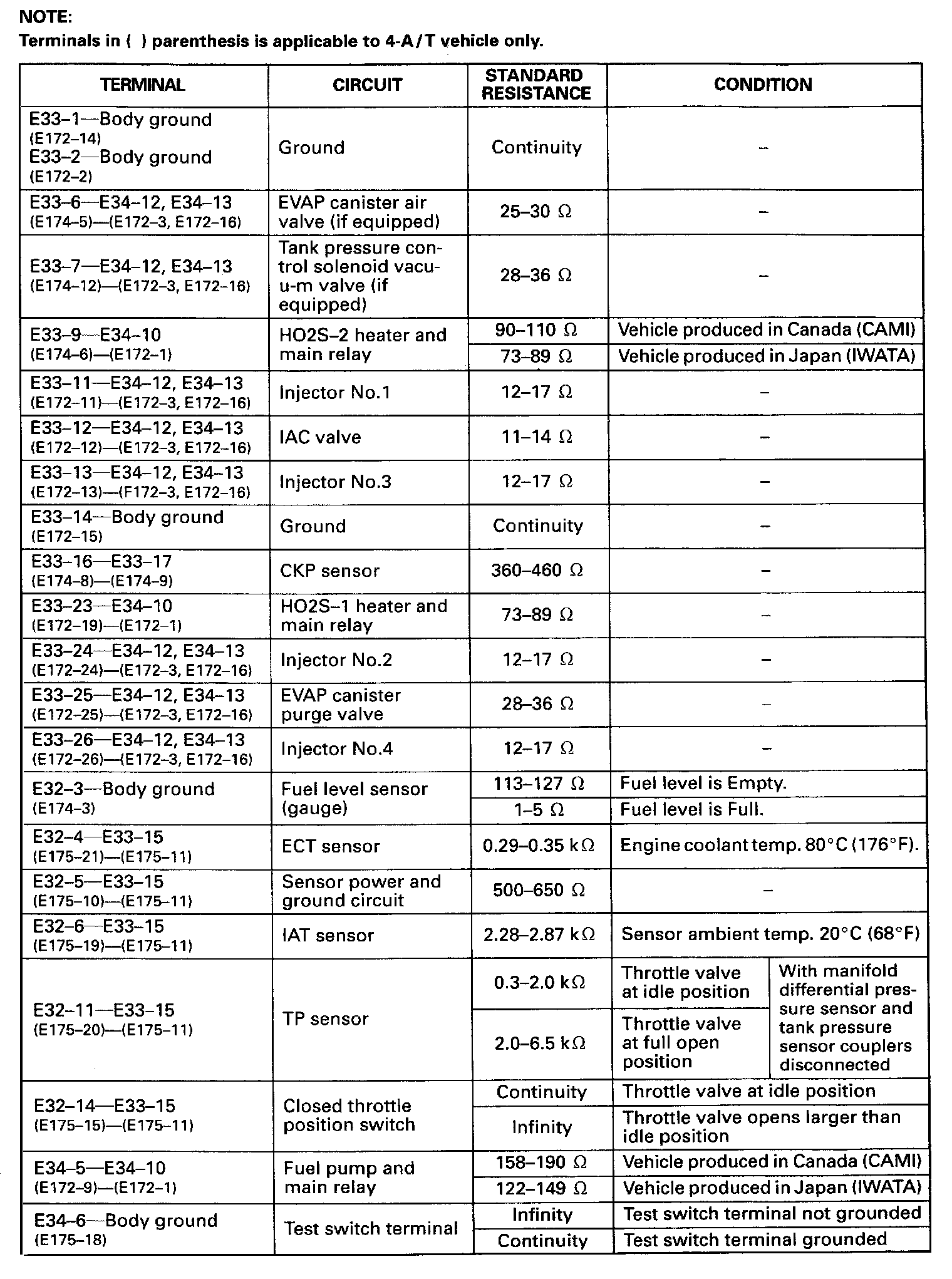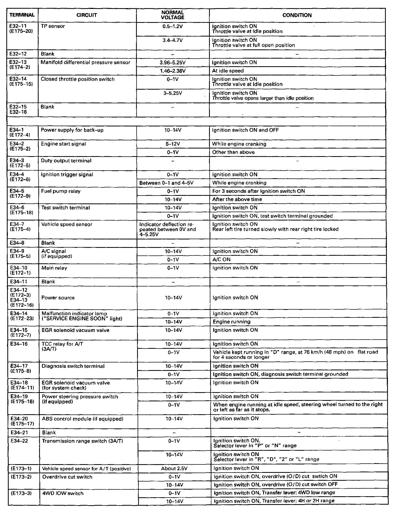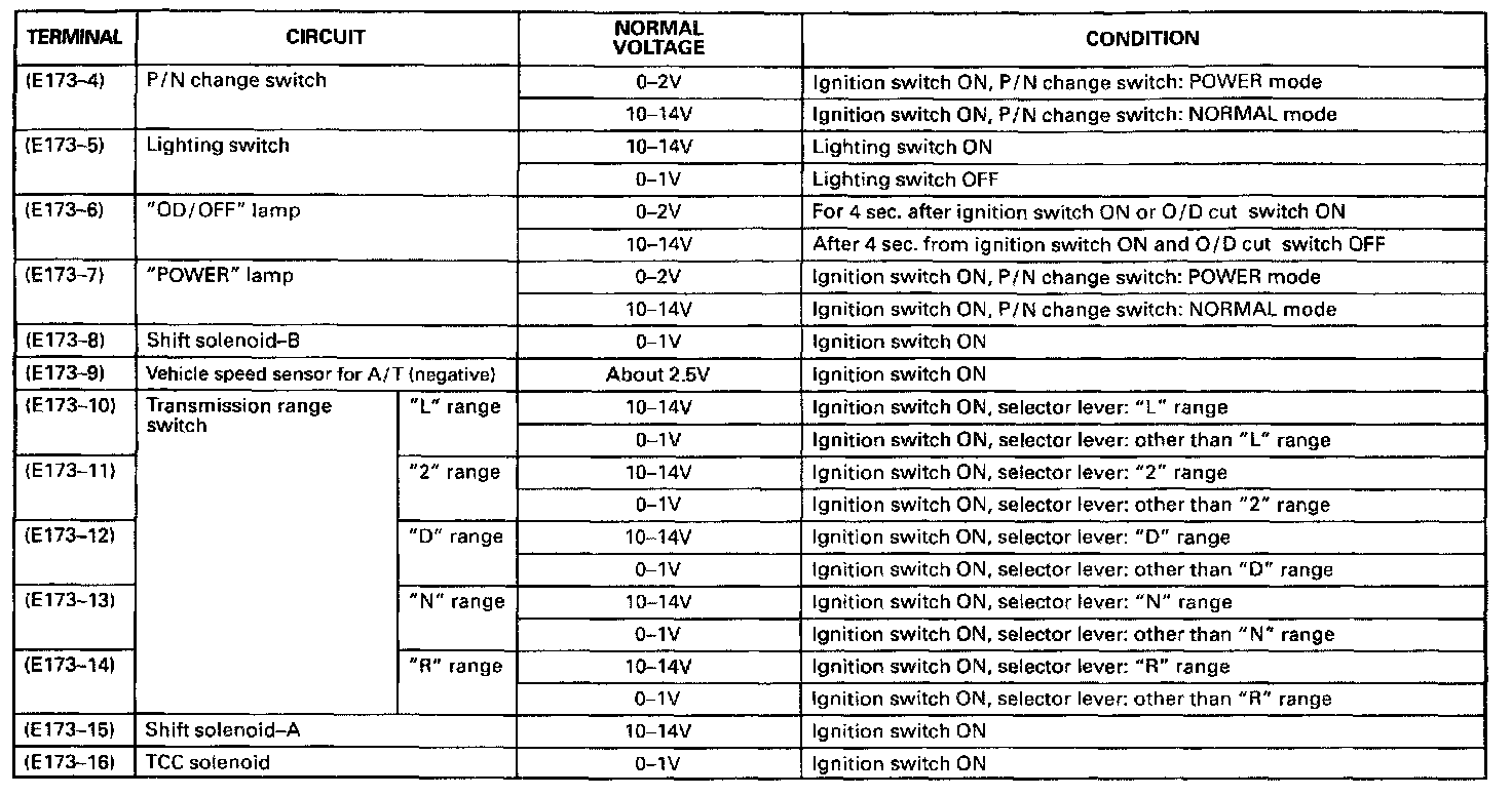 NOTE: As each terminal voltage is affected by the battery voltage, confirm that it is 11V or more when ignition switch is ON.