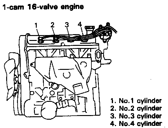 1.6L SOHC engine is illustrated. 1.8L DOHC engine cylinder configuration is the same.