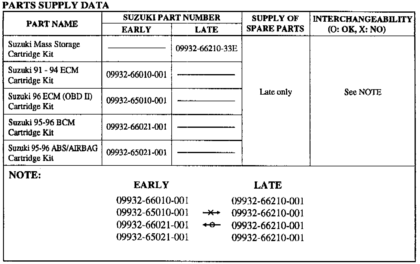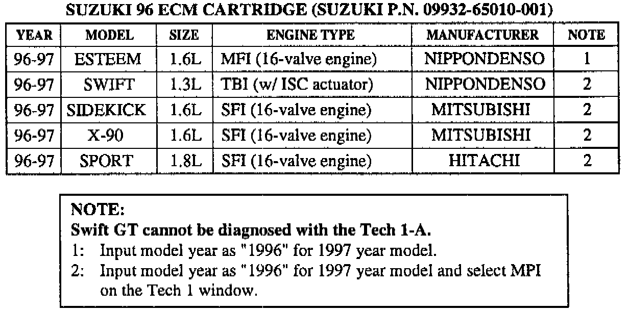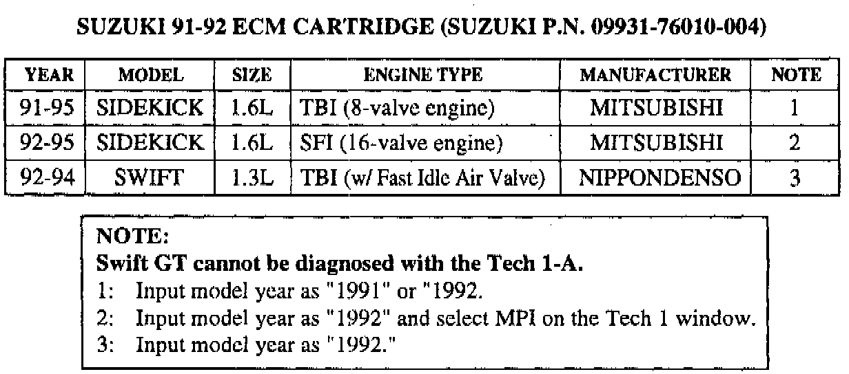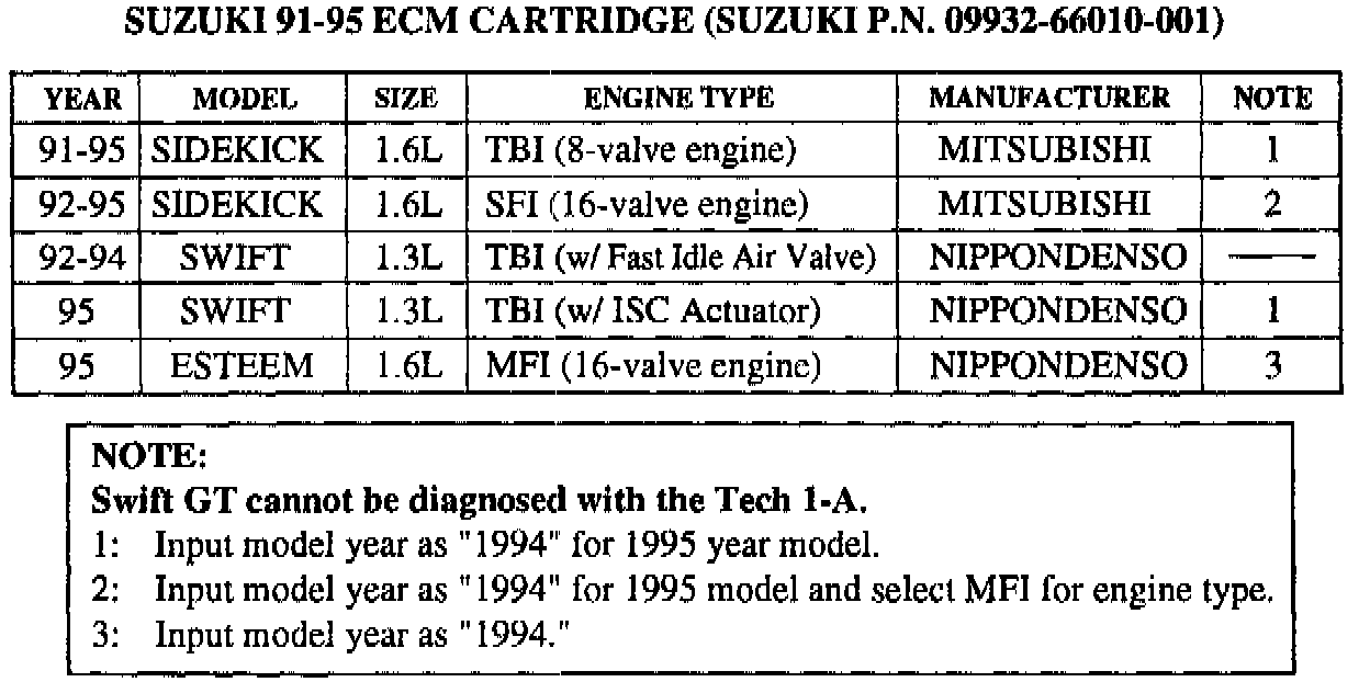 - THE 1991-1995 SUZUKI CARTRIDGE (09932-66010-001) WILL NOT SUPPORT THE 1991-1994 SWIFT GT (DOHC).