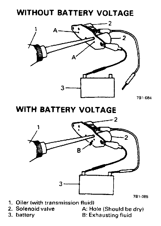 1) Apply oiler to solenoid valve and give compression by hands and then check to be sure that transmission fluid from oiler does not come out of holes in solenoid valve when battery voltage is not conducted.