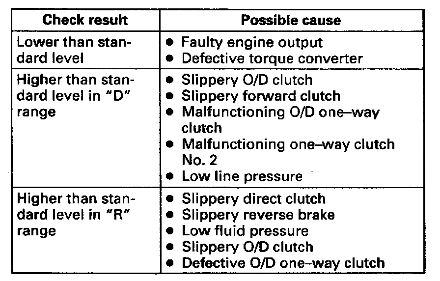This test is to check overall performance of automatic transmission and engine by measuring stall speed at "D" and '~R" ranges. Be sure to perform this test only when transmission fluid is at normal operating temperature and its level is between FULL and LOW marks.