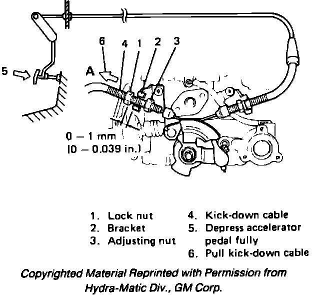 3. With accelerator pedal depressed fully and kickdown cable pulled in A direction, Fig. 16, adjust lock nut to bracket clearance to 0-.039 inch (0-1 mm) by turning lock nut. When adjusting clearance, ensure adjusting nut does not contact against bracket.