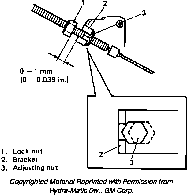 4. Release accelerator pedal and adjust lock nut to bracket clearance to 0-.039 inch (0-1 mm) by tightening adjusting nut. Use care to keep lock nut in place.