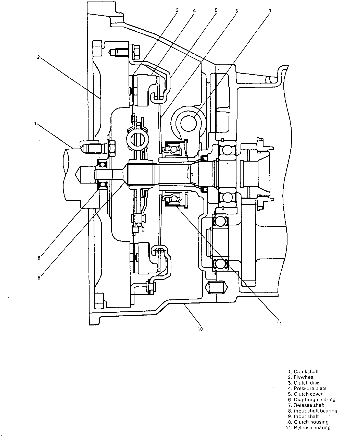 The clutch is a diaphragm-spring clutch of a dry single disc type. The diaphragm spring is of a tapering-finger type, which is a solid ring in the outer diameter part, with a series of tapered fingers pointing inward.