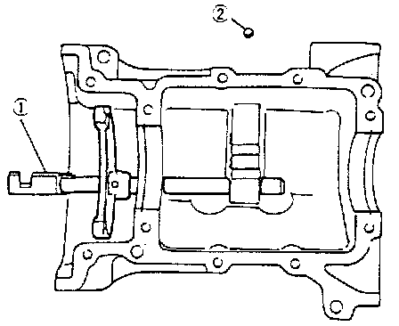 1. With fork installed to reverse gear shift shaft (1), install it into case and put in interlock ball (2).