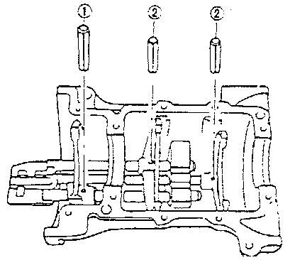 - Reverse gear shift fork spring pin (1) is different from other pins (2) in length. It is longer than other pins.