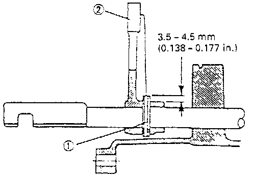 - When pressing spring pin (1) into reverse gear shift fork (2), do not allow to go all the way in, but leave its end protruded as much as the length shown in figure.