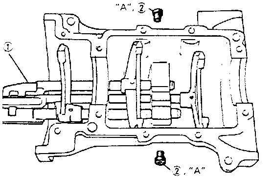 3. With both reverse and high speed gear shift shafts placed at neutral position, insert low speed gear shift shaft (1) into case and fix fork with spring pin. Then apply sealant to rubber plugs (2) and fit them in.