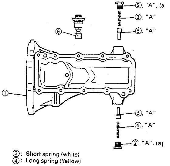 2. Remove select return spring bolts (2) and then springs (3) and (4) and guide pins (5).