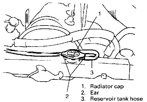 After installing radiator cap to radiator, make sure that its ear is aligned with reservoir tank hose as shown in figure. If not, turn cap more to align its ear with hose.