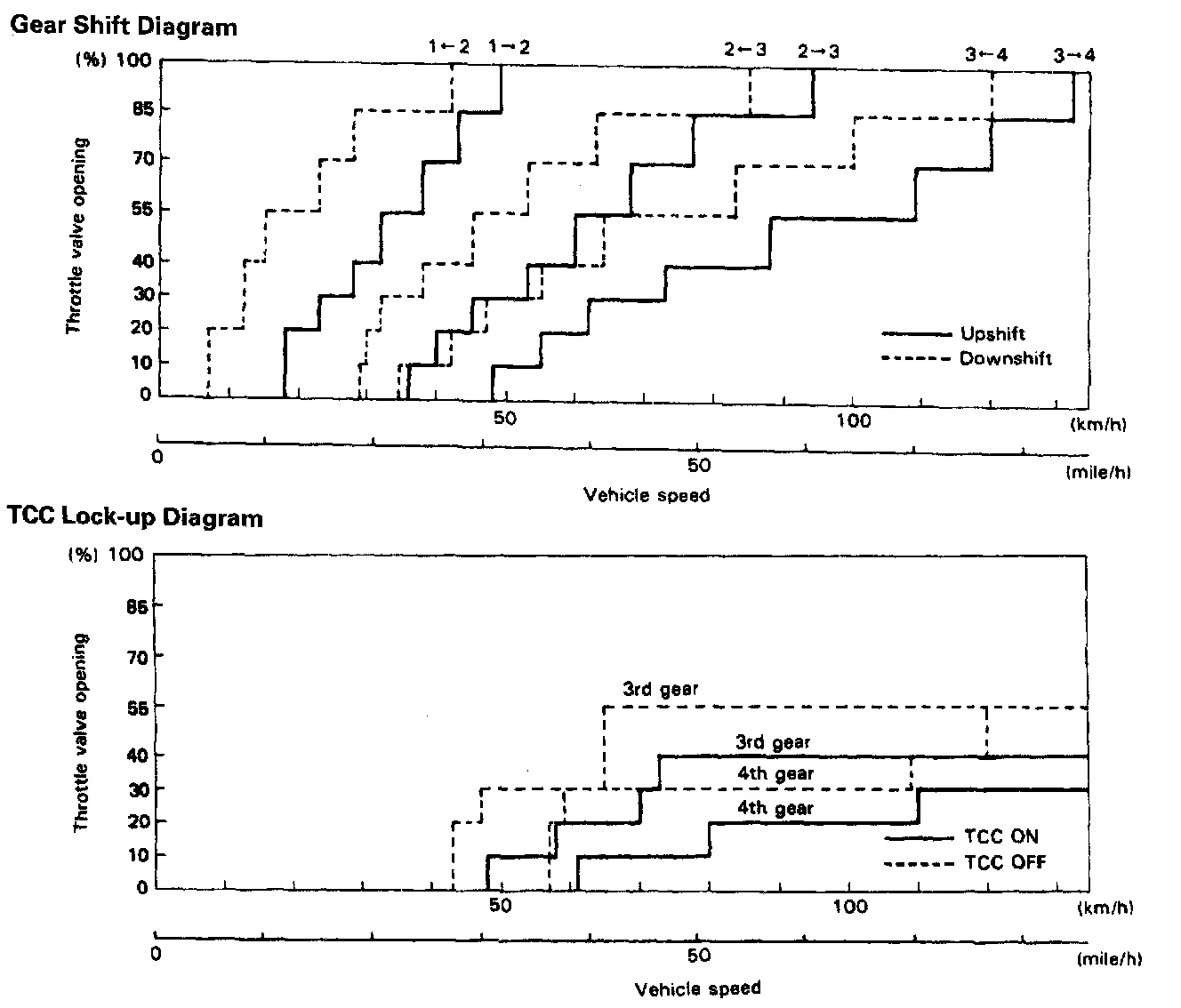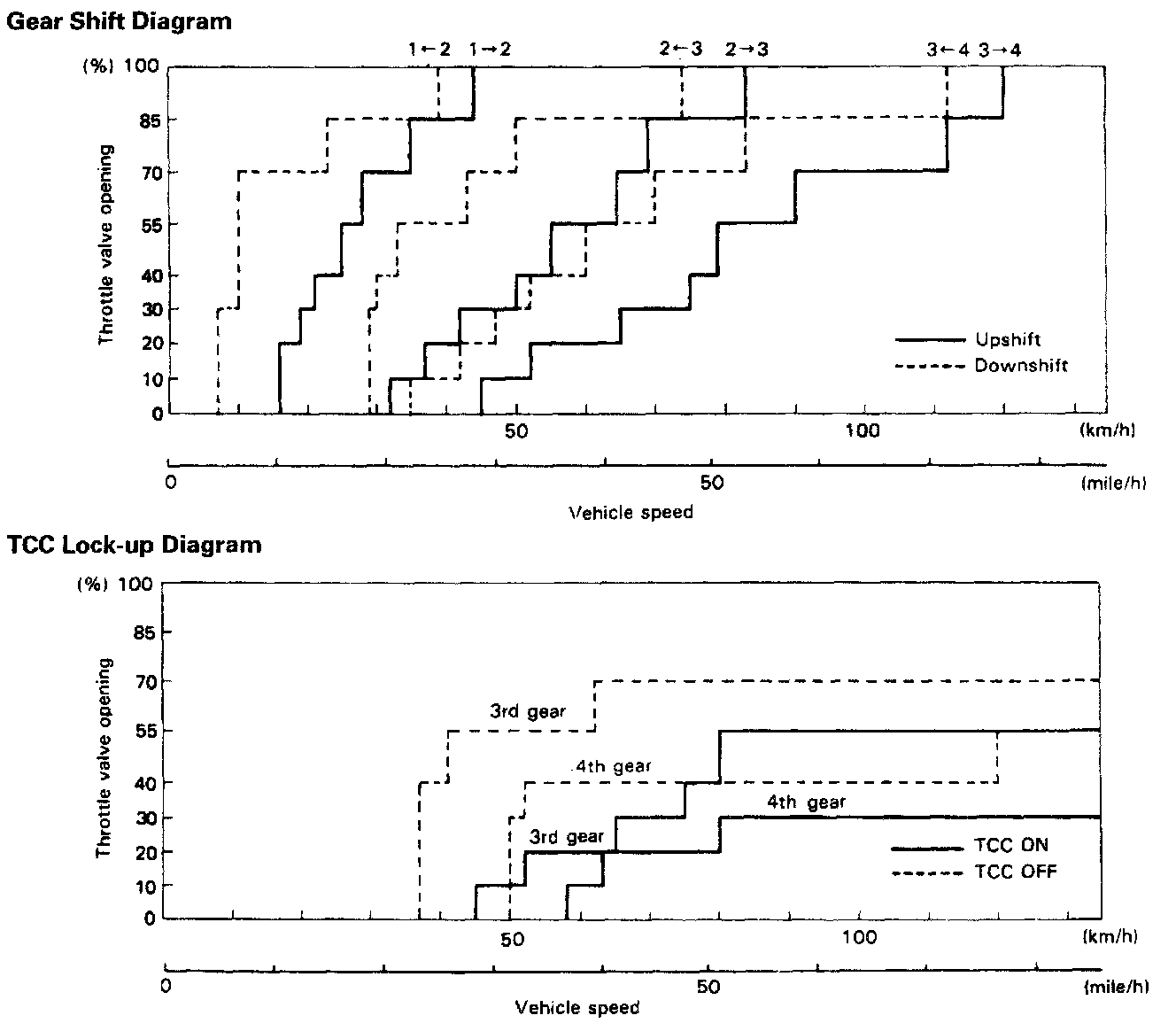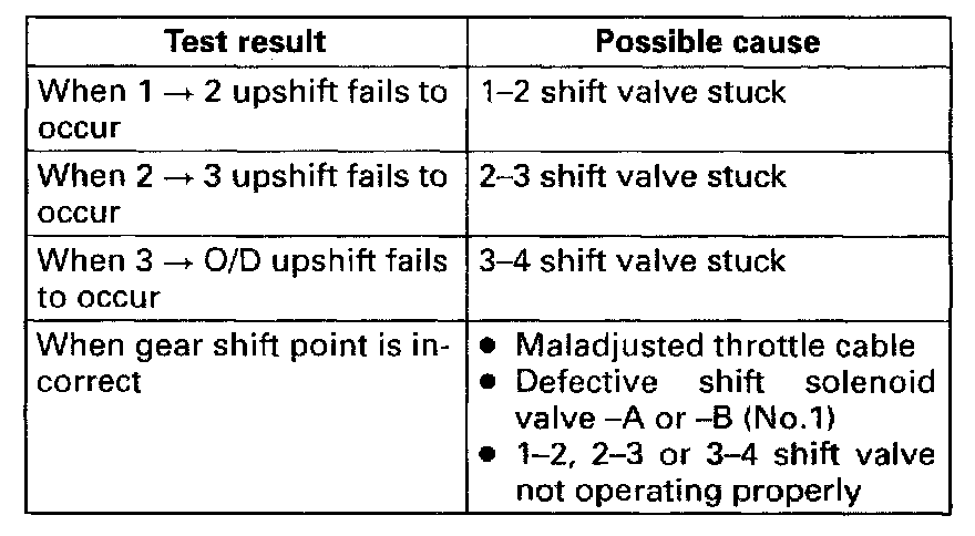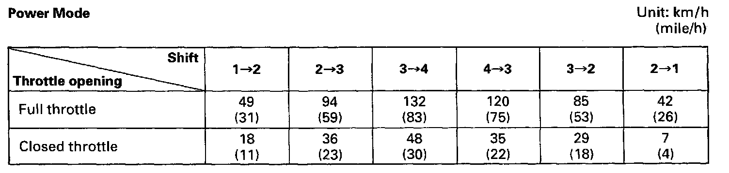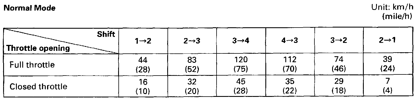 4) While driving in "D" range, check if gear shift occurs properly as shown in Gear Shift Diagram.