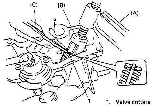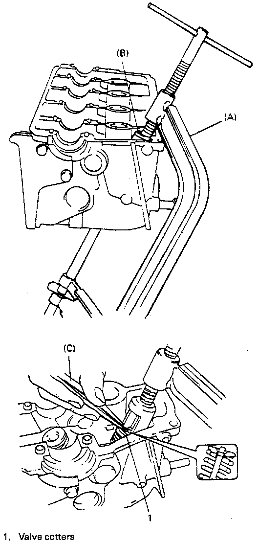 3. Using special tool (Valve lifter), compress valve springs and then remove valve cotters by using special tool (Forceps) as shown.