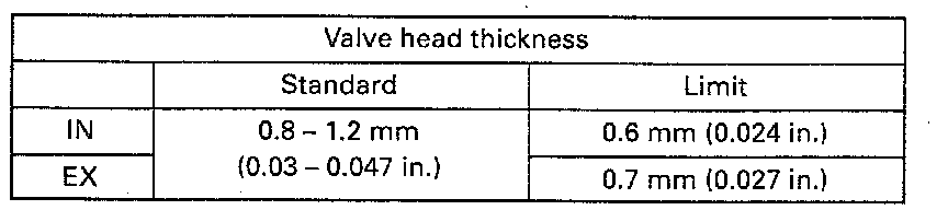 - Measure thickness of valve head. If measured thickness exceeds limit, replace valve.