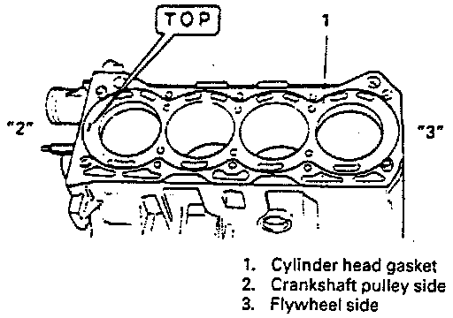 1. Remove oil gasket and oil on mating surfaces and install new head gasket as shown in figure, that is, "TOP" mark provided on gasket comes to crankshaft pulley side, facing up (toward cylinder head side).
