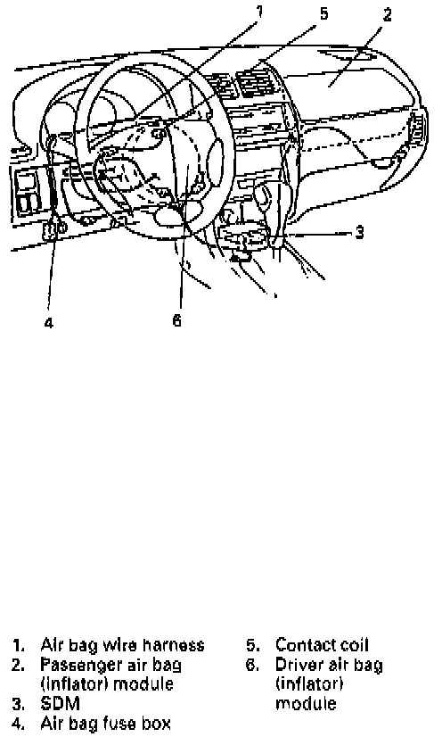- The configuration of air bag system parts are as shown in the figure. When it is necessary to service (remove, reinstall and inspect) these parts, be sure to follow procedures. Failure to follow proper procedures could result in possible air bag deployment, personal injury, damage to parts or air bag being unable to deploy when necessary.