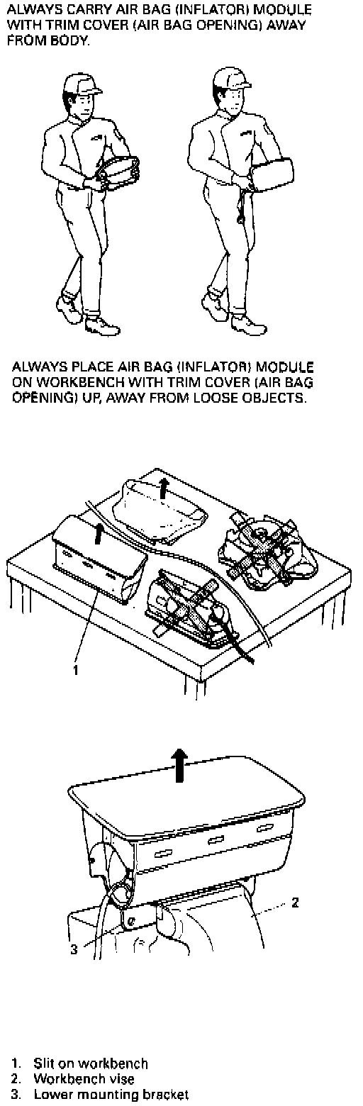 - When carrying a live air bag (inflator) module, make sure the bag opening is pointed away from you. In case of an accidental deployment, the bag will then deploy with minimal chance of injury. Never carry the air bag (inflator) module by the wires or connector on the underside of the module. When placing a live air bag (inflator) module on a bench or other surface, always face the bag up, away from the surface. As the live passenger air bag (inflator) module must be placed with its bag (trim cover) facing up, place it on the workbench with a slit or use the workbench vise to hold it securely at its lower mounting bracket. This is necessary so that a free space is provided to allow the air bag to expand in the unlikely event of accidental deployment. Otherwise, personal injury may result.