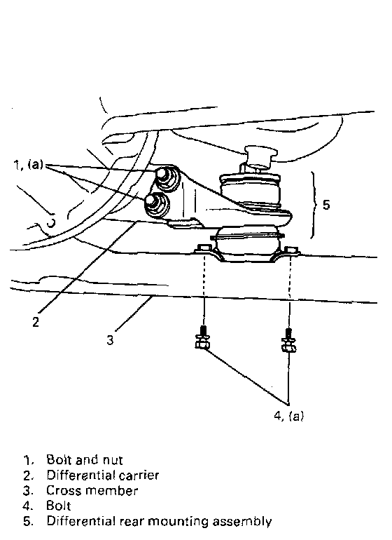 1. Lift up vehicle and remove mounting assembly by removing 2 bolts and nuts from differential carrier side and 2 bolts from cross member side.