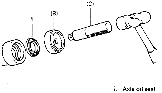 NOTE: As depth to which oil seal should be driven into axle housing is different between the left and right, be sure to check stamped marks on special tool (B) and drive each oil seal to corresponding mark.